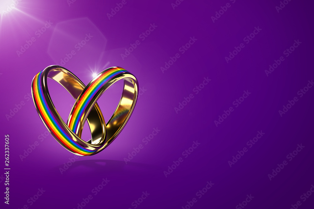Two Hovering Wedding Rings With Rainbow Colors Isolated On Purple Background Equal Rights Movement For Gay Marriages And Gender Equality Concept Copy Space On The Left Side 3d Rendering Stock Illustration